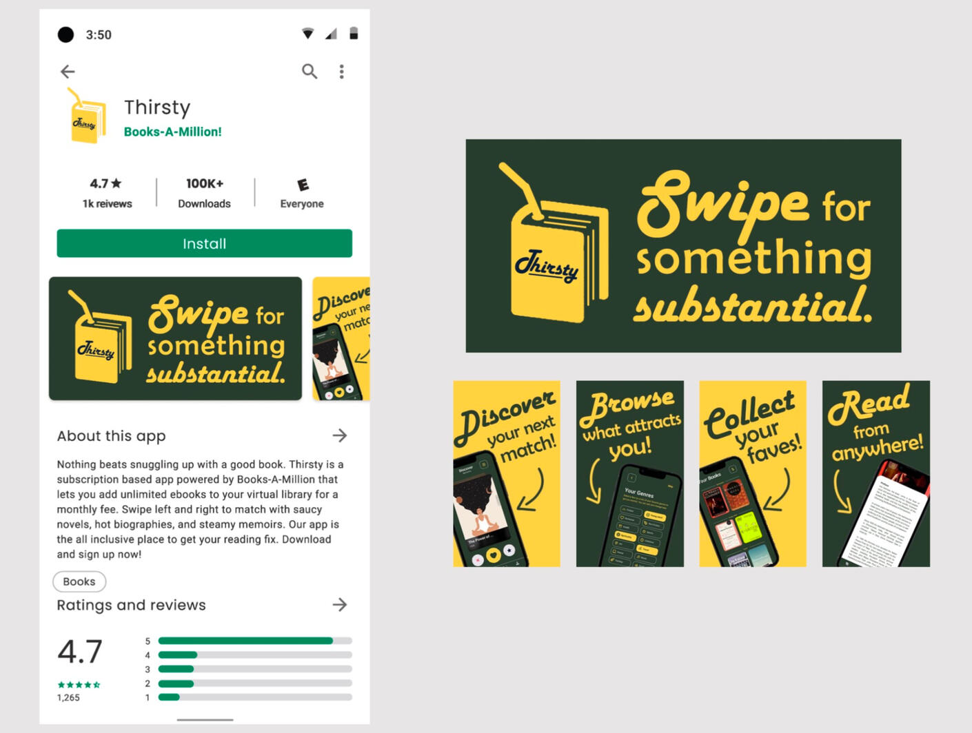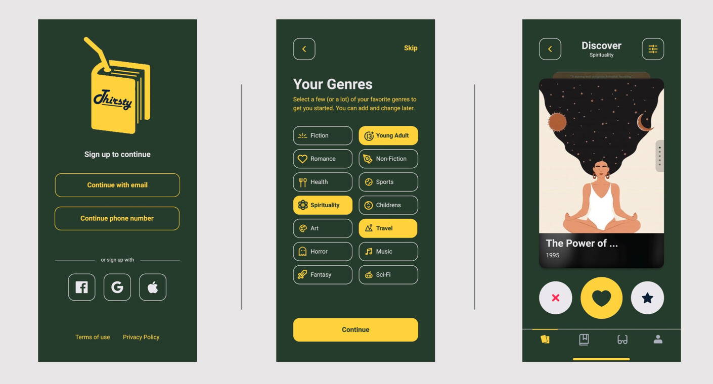 After listening to Kanye it was clear that our vision could be executed with a tinder-like-app for books. Here is a video showing the user interface we designed for a Books-A-Million app called Thirsty.