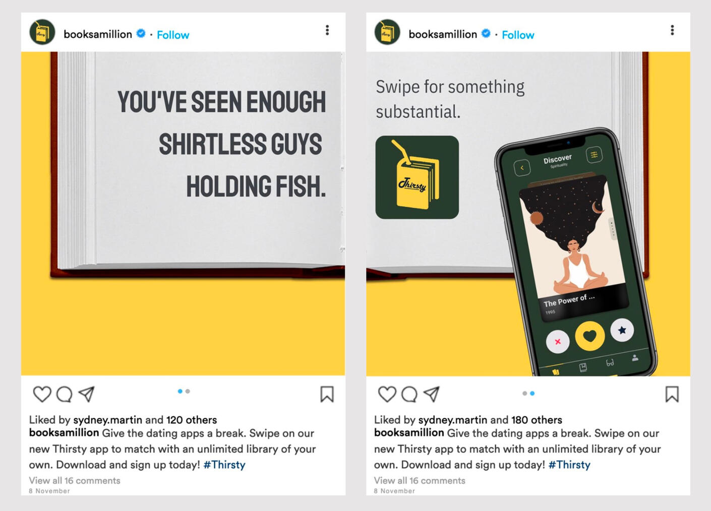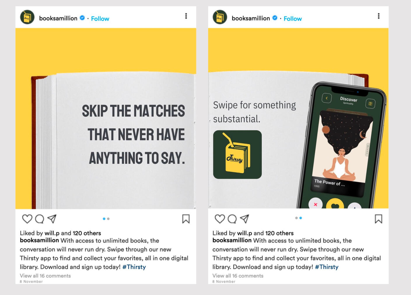 This app allows users swipe through books the same way you swipe through Tinder. Users are able to subscribe with a monthly fee and use the app's e-reader to instantly enjoy a book they found on Thirsty.